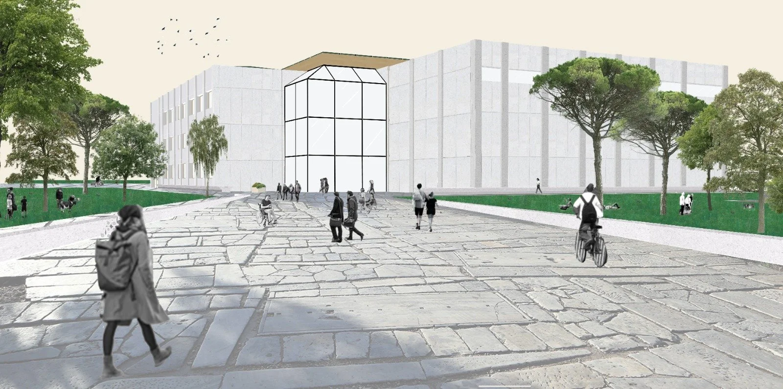 The Istituto Statale di Istruzione Secondaria Superiore Fabio Besta in Treviso has been redesigned to strengthen the relationship between the school and the city, improving access and establishing a clear visual connection with the historic center. What was once an enclosed plot has been transformed into a public park that also functions as the school’s garden. A boulevard extends into the green space, leading to a generous entrance marked by a weeping willow—an explicit reference to Louis Kahn’s idea that “schools began with a man under a tree.”